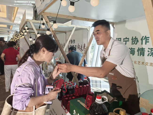 活動現(xiàn)場氣氛熱烈。與會領(lǐng)導為參與“閩寧協(xié)作·山海情深向未來”閩寧文化藝術(shù)交流培訓班的學員頒發(fā)了結(jié)業(yè)證書。舞臺上,《我的灘羊情》《長城隨想》《長城關(guān)》《飲風花馬湖》等富有鹽池縣地域特色的文化藝術(shù)精品,向現(xiàn)場嘉賓充分展現(xiàn)了鹽池縣深厚的文化歷史底蘊。舞臺下,鹽池灘羊肉香氣飄逸,清燉羊肉、烤全羊讓現(xiàn)場嘉賓贊不絕口。羊肝辣醬、蕎麥殼耳枕、手工刺繡等非遺產(chǎn)品、文創(chuàng)手工藝品等豐富展品吸引眾多嘉賓駐足咨詢與交流,互留通訊信息,洽談合作意向。