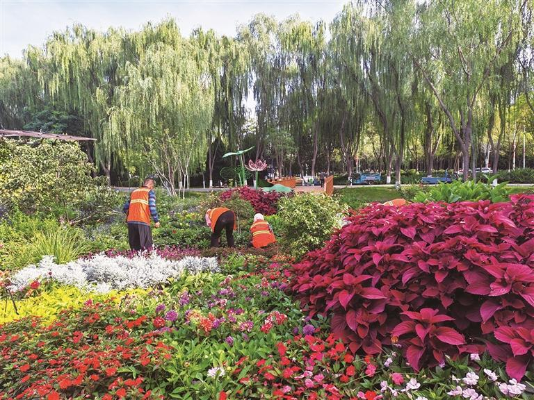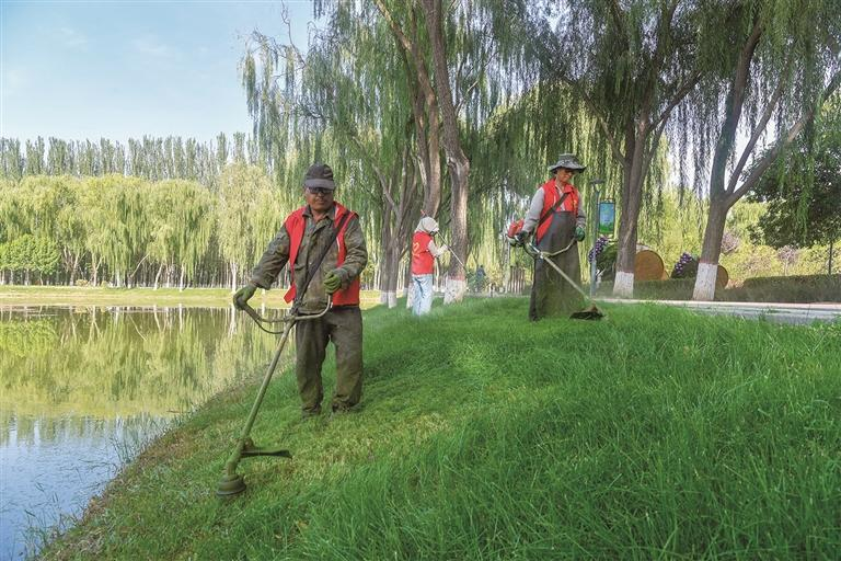 9月10日下午,在銀川鳳凰公園西側(cè)綠地,園林工人頂著烈日作業(yè),伴隨著割灌機的轟鳴聲,一株株蒿草被連根清除。
