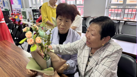 社區(qū)手工老師與工作人員化身“文化向?qū)А?,從絲帶色彩搭配、鮮花造型組合,到膠水用量把控、作品收尾固定,每一個(gè)步驟都進(jìn)行手把手示范,同時(shí)鼓勵(lì)大家打破模板限制,結(jié)合個(gè)人喜好大膽創(chuàng)作。
