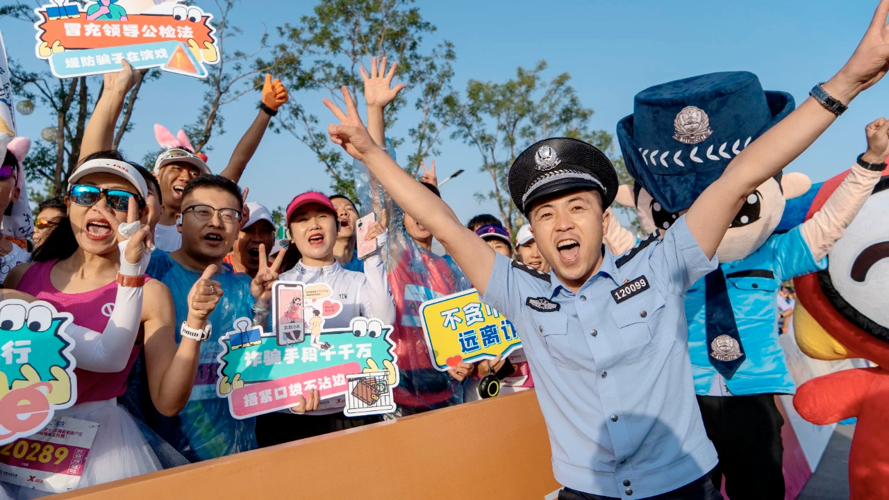 賽道沿途,20余處反詐提示牌化身“移動(dòng)安全站”,沿著賽道動(dòng)態(tài)展示反詐標(biāo)語(yǔ)?!胺涝p護(hù)跑、安心開(kāi)跑”“跑贏馬拉松,更要跑贏詐騙”等幽默標(biāo)語(yǔ)與跑道計(jì)時(shí)芯片、卡通警察形象巧妙結(jié)合,為選手打造“跑一步、學(xué)一句”的沉浸式反詐體驗(yàn)。