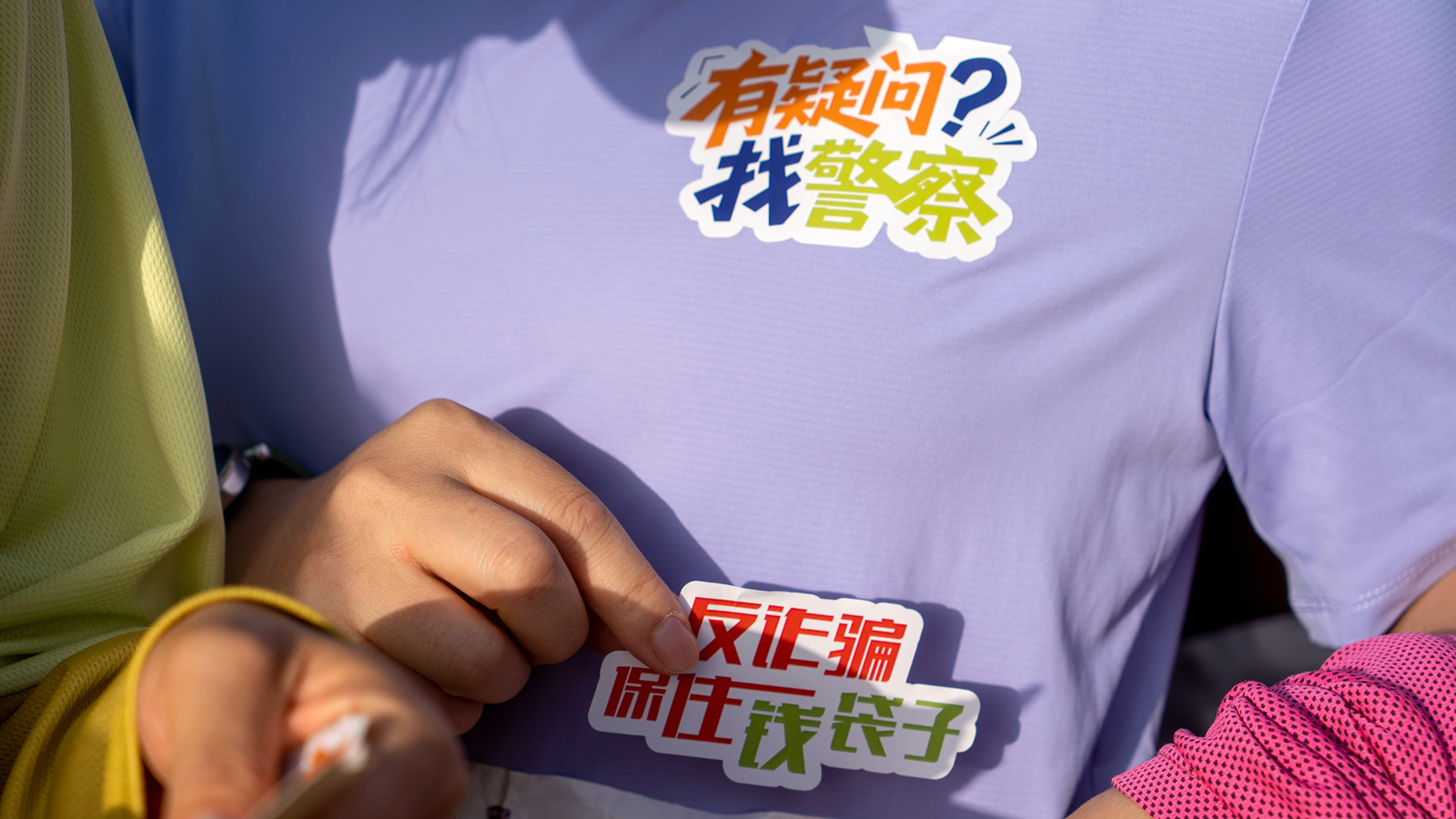 賽事當(dāng)日,4000余張“別讓騙子跑過(guò)你”主題貼畫在起跑區(qū)掀起一場(chǎng)熱烈的“反詐加油”浪潮。民警手持貼畫穿梭在人群中,熱情地將一張張色彩鮮艷、設(shè)計(jì)活潑的反詐貼畫輕輕貼在跑者們的參賽服上。
