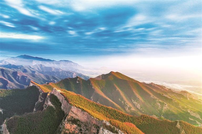 云海漫過的天際線,是清晨6點的饋贈。從無人機的視角去看,乳白色的云絮從峽谷漫溢而出,如綢緞般纏繞著金頂。陽光刺破云層的瞬間,云蒸霞蔚的光暈為裸露的巖層鍍上了金邊。山腳下的油松林在霧氣中若隱若現(xiàn),宛若水墨畫卷里暈開的淡墨。