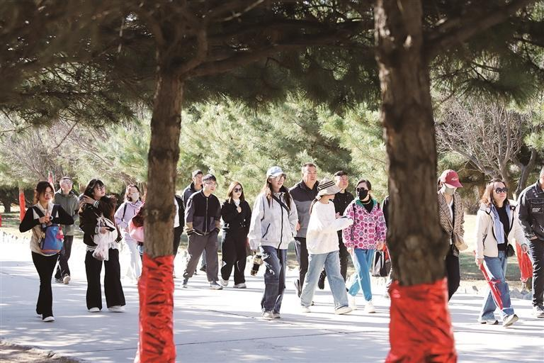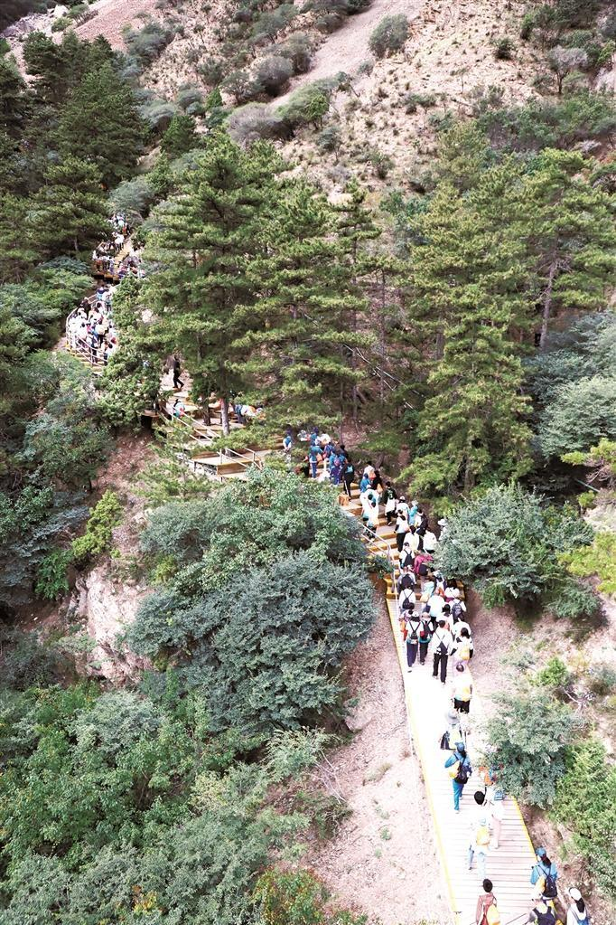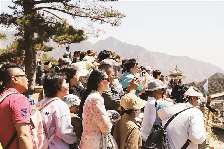 山路上的攀登者構(gòu)成了流動的風景線,穿沖鋒衣的年輕人手挽手沖刺,扎羊角辮的孩童被父親架在肩頭,正午的陽光透過枝葉間隙,在他們汗?jié)竦念~頭上跳躍??扉T定格的瞬間,每個人臉上的笑容比秋陽更加燦爛。