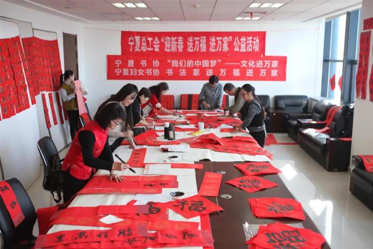 萬里晴空風(fēng)和煦,春風(fēng)送暖福臨門。1月14日下午,自治區(qū)總工會機關(guān)舉辦首場“迎新春 送萬福 進(jìn)萬家”公益活動,有幸邀請到寧夏婦女書法家協(xié)會主席喬華以及趙萍、趙彥、蘇詠梅、何軍菁等6名書法家現(xiàn)場創(chuàng)作對聯(lián)等書法作品500份。一個個厚實飽滿的“福”字、一副副氣韻生動的春聯(lián),寄托著對新的一年美好的期盼和祝福,讓大家在感受喜慶的同時還體會到了中國書法的傳統(tǒng)文化魅力,濃濃的新年氣息撲面而來。