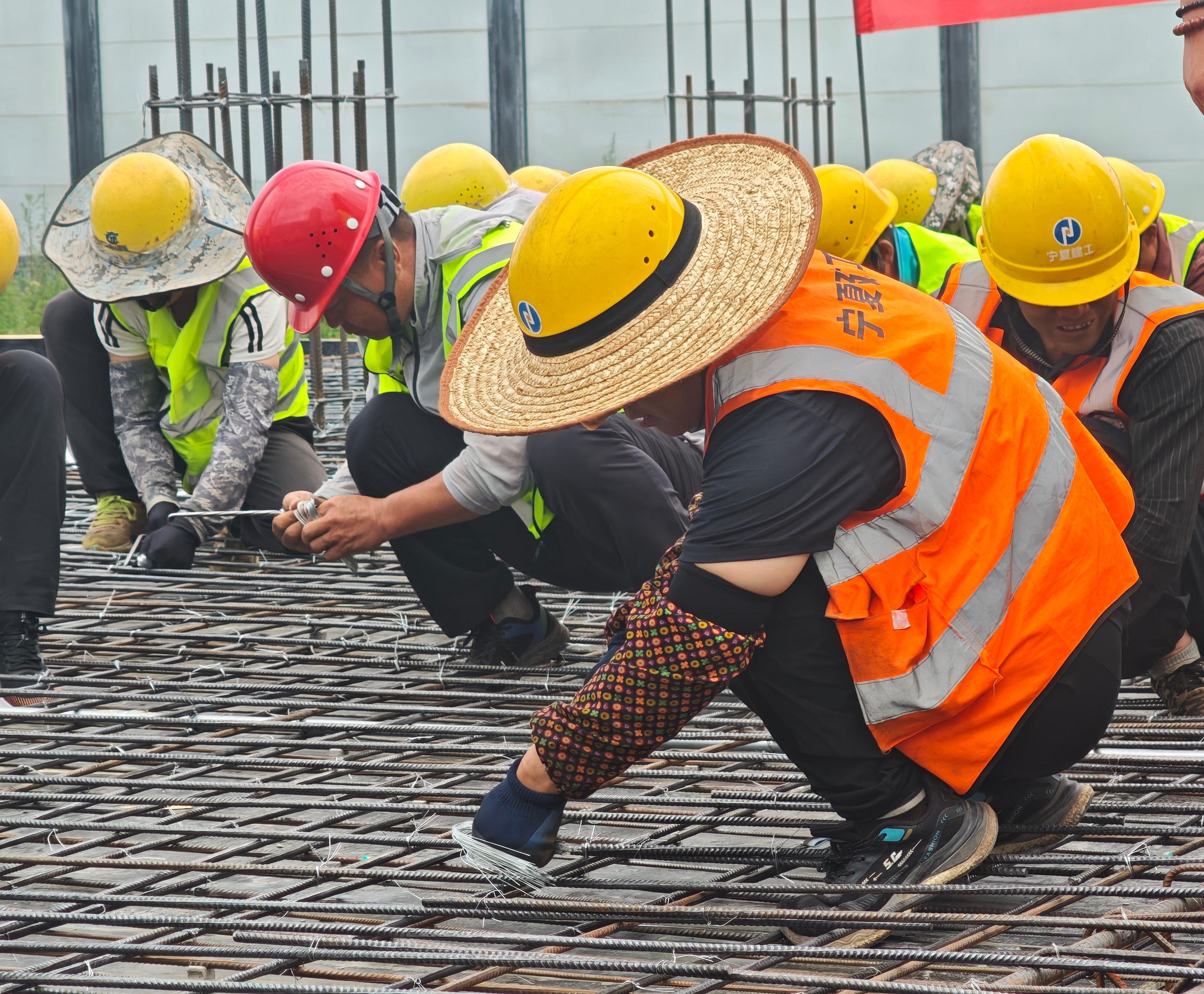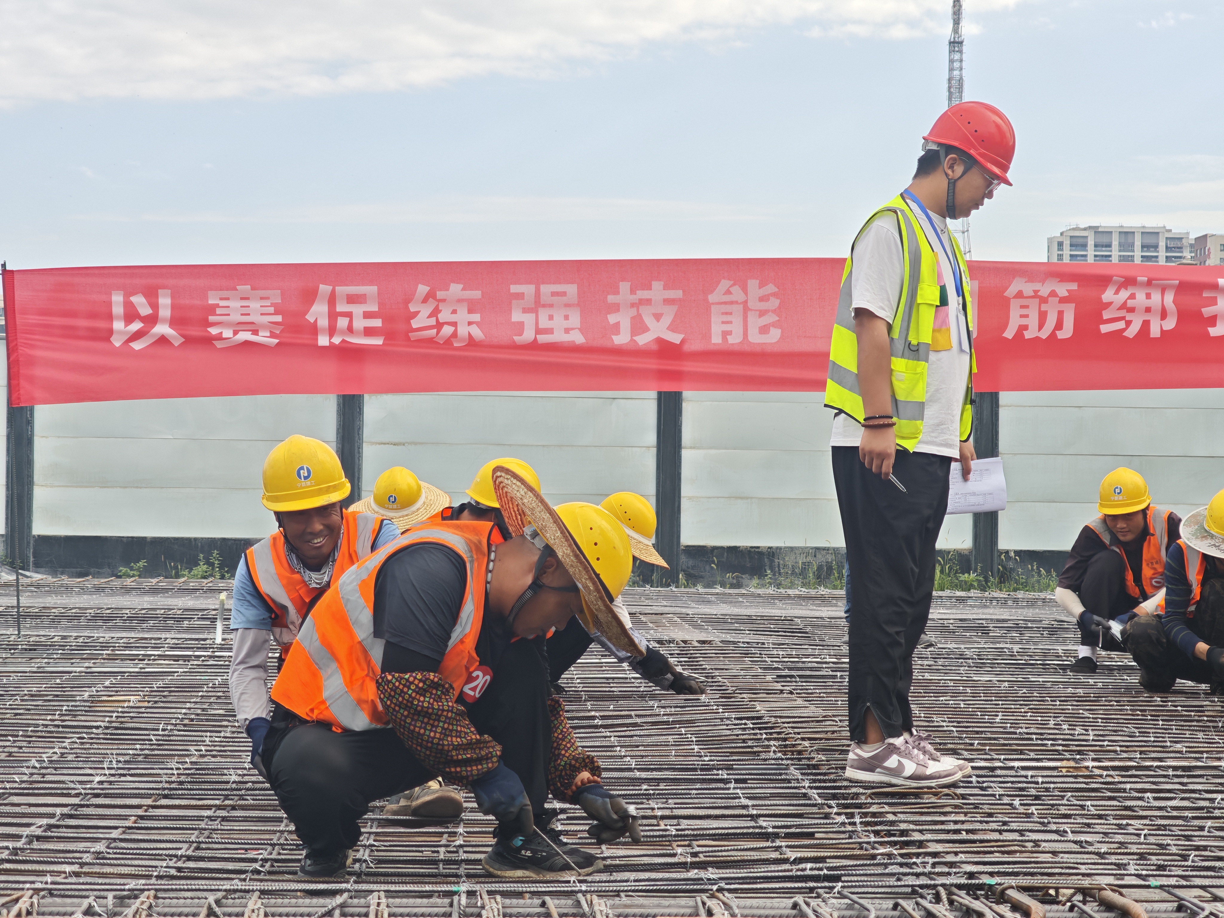 比賽現(xiàn)場,鋼筋工們化身“鋼鐵裁縫”,手持扎鉤、卷尺迅速投入“戰(zhàn)斗”。拉直、定位、綁扎、固定……一系列動作行云流水,原本零散的鋼筋在他們手中快速“成型”,精準(zhǔn)貼合圖紙要求。汗水浸濕了工裝,卻絲毫未影響大家的專注——有人緊盯間距標(biāo)尺確保誤差不超2毫米,有人反復(fù)檢查綁扎節(jié)點(diǎn)保證牢固度,現(xiàn)場不時(shí)響起鋼筋碰撞的清脆聲響,奏響項(xiàng)目建設(shè)的“奮進(jìn)樂章”。